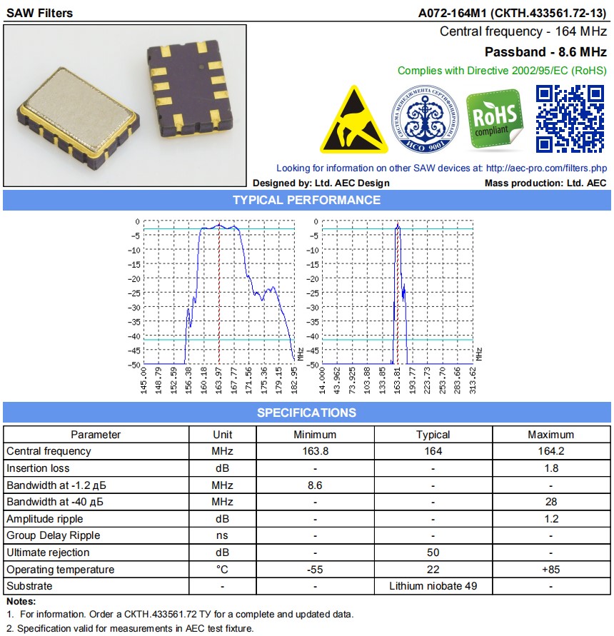 | Bandwidth at -1.2 дБ | MHz | 8.6 | - | - |