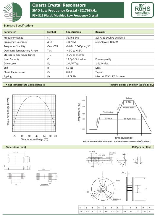 AEL晶振,PSX-315晶振,32.768KHZ晶振,貼片表晶32.768K系列具有超小型,薄型,質(zhì)地輕的表面貼片音叉型石英晶體振蕩器,晶振產(chǎn)品本身具備優(yōu)良的耐熱性,耐環(huán)境特性,在辦公自動(dòng)化,家電領(lǐng)域,移動(dòng)通信領(lǐng)域可發(fā)揮優(yōu)良的電氣特性,符合無鉛標(biāo)準(zhǔn),滿足無鉛焊接的回流溫度曲線要求,金屬外殼的石英晶振使得產(chǎn)品在封裝時(shí)能發(fā)揮比陶瓷晶振外殼更好的耐沖擊性能.