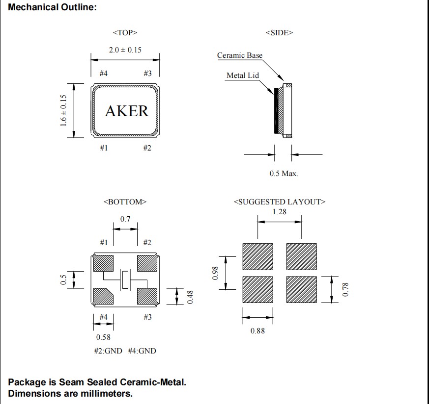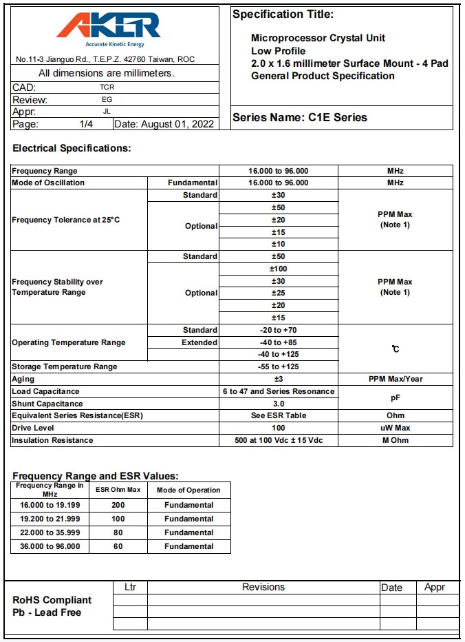 | C1E-16.000-12-1530-X-R | Aker安碁晶振 | 石英晶體 | Microprocessor Crystal Unit Low Profile 2.0 x 1.6 millimeter Surface Mount |