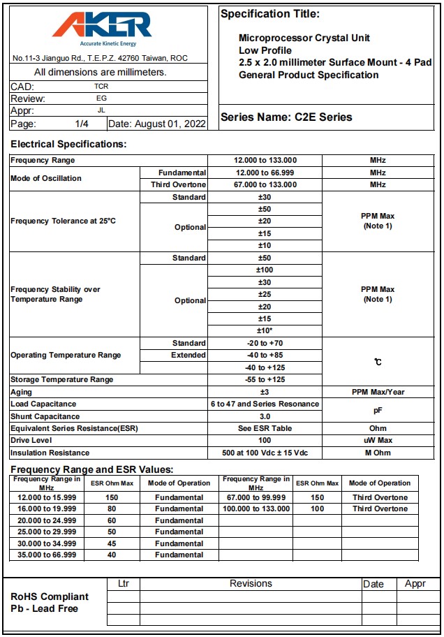 | C2E-20.000-12-50100-X1-R | Aker晶振 | Crystal 20MHz ±50ppm (Tol) ±100ppm (Stability) 12pF FUND 100Ohm Automotive 4-Pin SMD T/R |