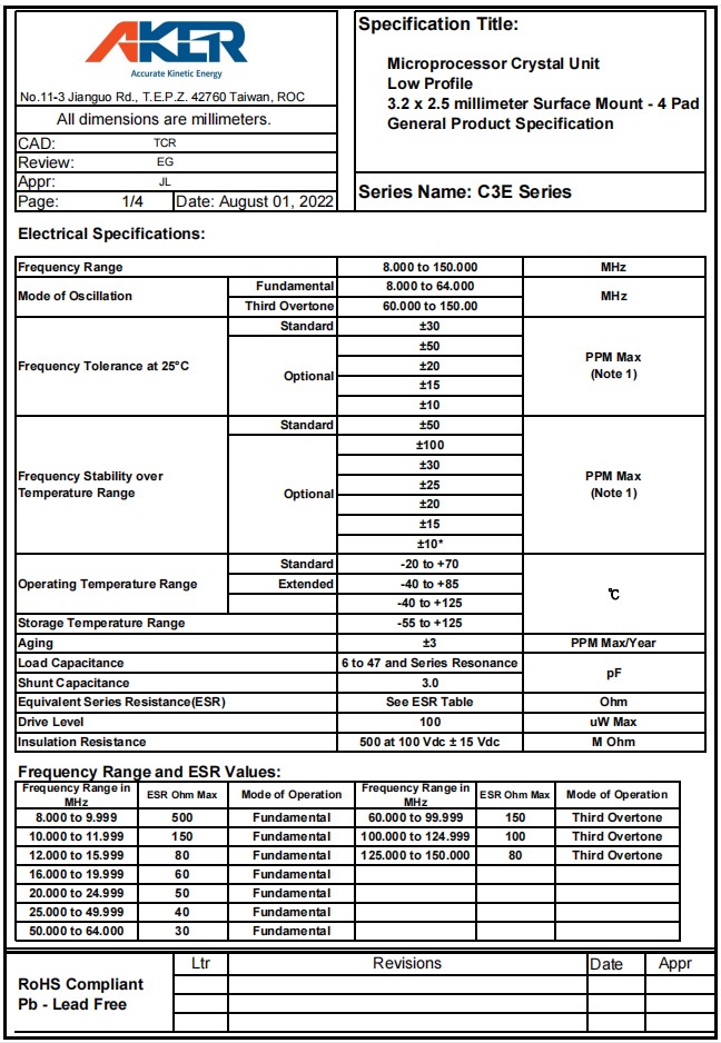 | C3E-18.080-8-50100-X1-R | Aker晶振 | Crystal 18.08MHz ±50ppm (Tol) ±100ppm (Stability) 8pF FUND 100Ohm Automotive 4-Pin SMD T/R |