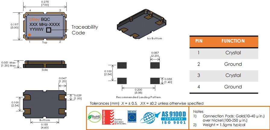 BQCSA-75MF-DCDGT,75MHz,7050mm,Bliley百利晶振,BQCSA,石英貼片晶振,尺寸圖