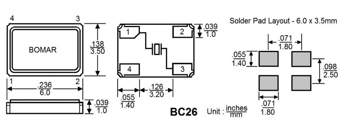BC26EFI120-40.000000,6035mm,40MHz,Bomar四腳貼片晶振,BC26,測試設(shè)備晶振,尺寸圖