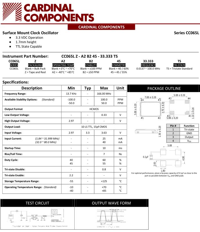 Cardinal晶振,CC065L晶振,CC065LZ-A2B245-26.000TS晶振,小型SMD有源晶振,從最初超大體積到現(xiàn)在的7050mm,6035mm,5032mm,3225mm,2520mm體積,有著翻天覆地的改變,體積的變小也使產(chǎn)品帶來了更高的穩(wěn)定性能,接縫密封石英晶體振蕩器,精度高,覆蓋頻率范圍寬的特點(diǎn),SMD高速自動(dòng)安裝和高溫回流焊設(shè)計(jì),Optionable待機(jī)輸出三態(tài)輸出功能,電源電壓范圍:1.8V~5V,高穩(wěn)定性,低抖動(dòng),低功耗,主要應(yīng)用領(lǐng)域:無線通訊,高端智能手機(jī),平板筆記本W(wǎng)LAN,藍(lán)牙,數(shù)碼相機(jī),DSL和其他IT產(chǎn)品的晶振應(yīng)用,三態(tài)功能,PC和LCDM等高端數(shù)碼領(lǐng)域,符合RoHS/無鉛.
