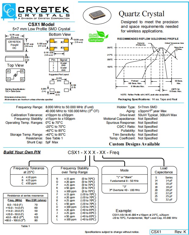 CSX1-BH3-20-45MHz,CRYSTEK瑞斯克晶振,SMD石英晶體,CSX1-AL1-16-26MHz,6G無線應用晶振,參數表