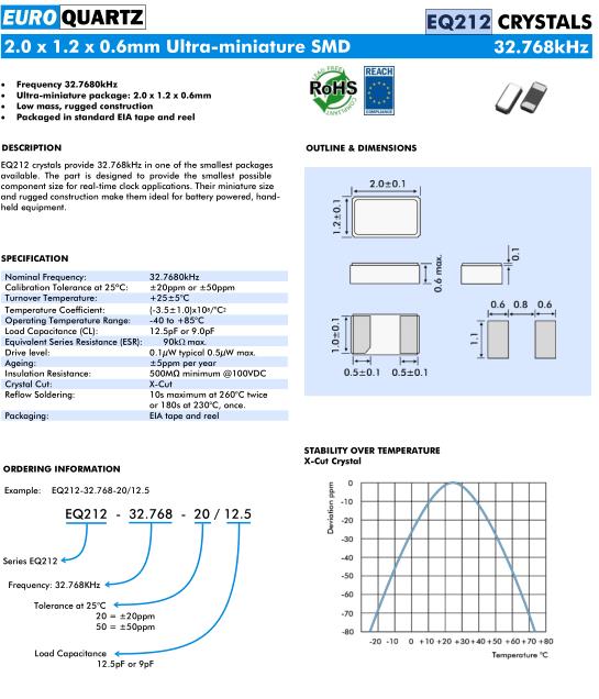 Euroquartz晶振,EQ212晶振,Q212-32.768-20/12.5晶振,32.768K時鐘晶體具有小型,薄型,輕型的貼片晶振表面音叉型晶體振蕩器,產品具有優良的耐熱性,耐環境特性,可發揮晶振優良的電氣特性,符合RoHS規定,滿足無鉛焊接的高溫回流溫度曲線要求,金屬外殼的封裝使得產品在封裝時能發揮比陶瓷振蕩器外殼更好的耐沖擊性.