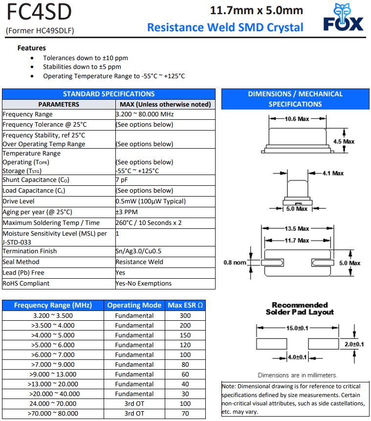| FC4SDCBMF14.7456-T1 | Fox晶振 | FC4SD | 14.7456 MHz | ±50ppm |