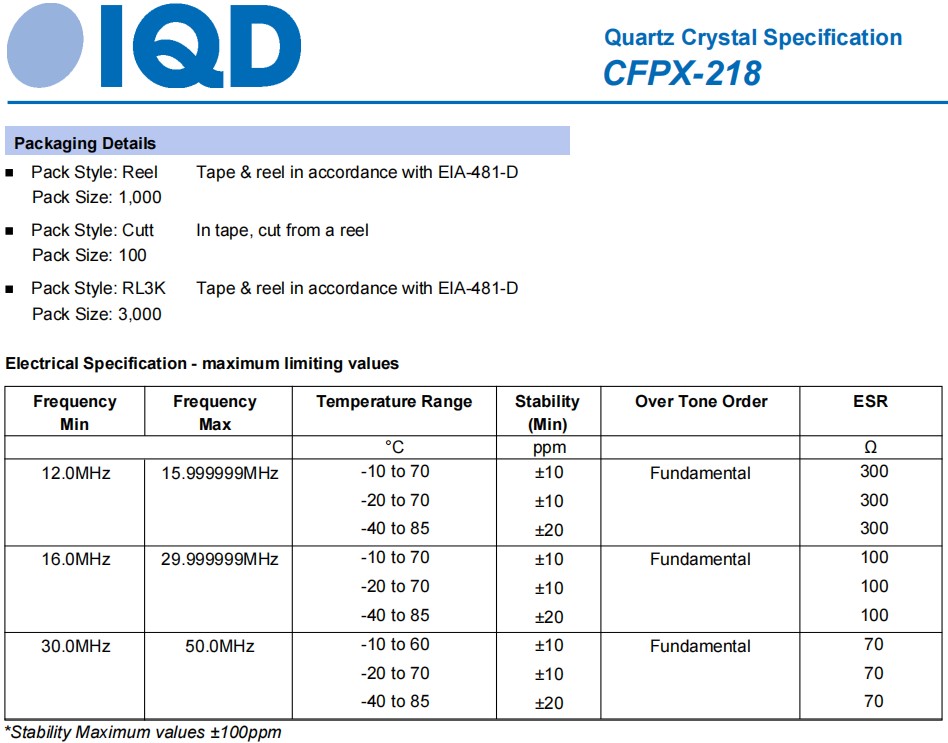 | LFXTAL069400REEL | IQD晶振 | CFPX-218 | CRYSTAL 18.4320MHZ 18PF SMD | 18.432 MHz |