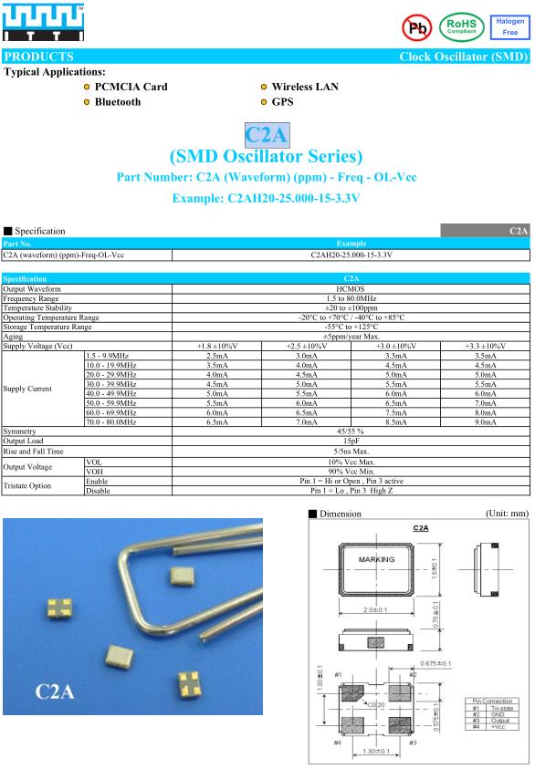 ITTI晶振,C2A晶振,C2AH20-26.000-15-3.3V晶振,2016mm體積的振蕩器,是目前有源晶振中體積最小的一款,產(chǎn)品本身帶溫度補(bǔ)償作用的晶體振蕩器,該體積產(chǎn)品最適合于GPS,以及衛(wèi)星通訊系統(tǒng),智能電話等多用途的高穩(wěn)定的頻率溫度特性晶振.為對(duì)應(yīng)低電源電壓的產(chǎn)品.