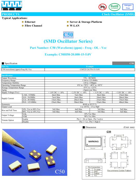 ITTI晶振,C50晶振,C50T25-24.000-15-5.0V晶振,5032mm體積的石英晶體振蕩器,有源晶振,該產(chǎn)品可驅(qū)動(dòng)2.5V的溫補(bǔ)晶振,壓控晶振,VC-TCXO晶體振蕩器產(chǎn)品,電源電壓的低電耗型,編帶包裝方式,可對(duì)應(yīng)自動(dòng)高速貼片機(jī)自動(dòng)焊接,及IR回流焊接(無(wú)鉛對(duì)應(yīng)),為無(wú)鉛產(chǎn)品,超小型,質(zhì)地輕.產(chǎn)品被廣泛應(yīng)用到集成電路,程控交換系統(tǒng),無(wú)線發(fā)射基站.