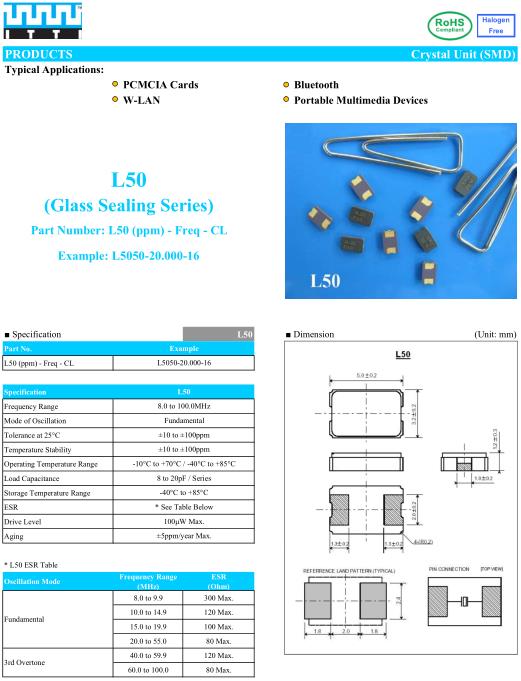 ITTI晶振,L50晶振,L5050-20.000-16晶振,貼片晶振本身體積小,超薄型石英晶體振蕩器,特別適用于有目前高速發(fā)展的高端電子數(shù)碼產(chǎn)品,因為晶振本身小型化需求的市場領(lǐng)域,小型,薄型是對應(yīng)陶瓷振蕩器(偏差大)和普通的石英晶體振蕩器(偏差小)的中間領(lǐng)域的一種性價比較出色的產(chǎn)品.產(chǎn)品廣泛用于筆記本電腦,無線電話,衛(wèi)星導(dǎo)航SSD,USB,Blu-ray等用途,符合無鉛焊接的高溫回流焊曲線特性.