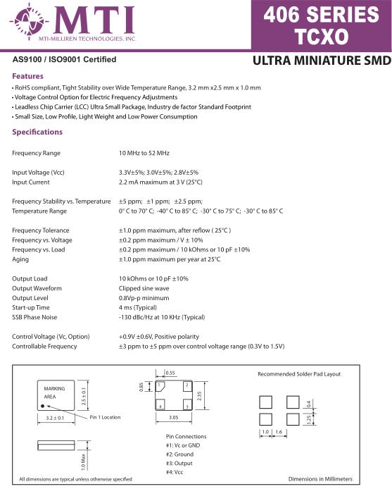 MTI晶振,406晶振,TCXO振蕩器,小型SMD有源晶振,從最初超大體積到現在的7050mm,6035mm,5032mm,3225mm,2520mm體積,有著翻天覆地的改變,體積的變小也使產品帶來了更高的穩定性能,接縫密封石英晶體振蕩器,精度高,覆蓋頻率范圍寬的特點,SMD高速自動安裝和高溫回流焊設計,Optionable待機輸出三態輸出功能,電源電壓范圍:1.8V~5V,高穩定性,低抖動,低功耗,主要應用領域:無線通訊,高端智能手機,平板筆記本WLAN,藍牙,數碼相機,DSL和其他IT產品的晶振應用,三態功能,PC和LCDM等高端數碼領域,符合RoHS/無鉛.