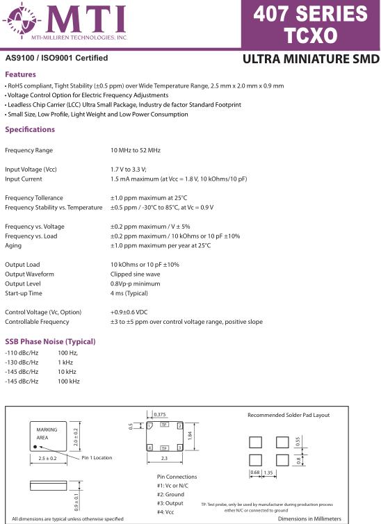 MTI Crystal可稱為米利倫晶振,擁有領先的制造技術和提供世界一流的客戶服務,專業提供MTI有源晶振,溫補晶振,貼片晶振等頻率元件,所有產品保證是高質量,精確和穩定的頻率控制元器件,并以高品質,高性能的產品得到市場的認可,使得MTI晶振聞名于天下.米利倫晶振,407晶振,2520mm有源晶振.