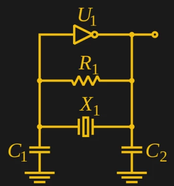有許多晶體振蕩器配置,但如果使用數(shù)字電路,最可能遇到的電路是Pierce振蕩器.您會發(fā)現(xiàn)它是使用離散邏輯門以及眾多微處理器和其他IC實現(xiàn)的.晶體配置有一對電容器和一個高值偏置電阻器,作為從反相器輸出到輸入的相移網(wǎng)絡(luò).其中一個電容器有時可以并聯(lián)一個小的可變電容器,允許進行非常小的頻率調(diào)整以校正各個晶體的容差.在晶體的共振頻率下,晶體上需要180度的相移以維持振蕩.