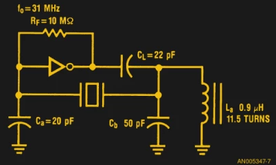 在實踐中,設(shè)計用于泛音的晶體將在其基頻的奇數(shù)倍處具有共振.因此,例如具有10MHz基頻的泛音晶振也將在30MHz和50MHz處具有泛音諧振. 在上面顯示的皮爾斯電路中放置一個泛音晶體不會導致它以泛音頻率振蕩,而是會在其基頻上運行.泛音振蕩器必須包含一個額外的調(diào)諧電路,用于抑制基頻,留下最突出的諧波諧振來決定振蕩頻率.在我們的CMOS振蕩器邏輯應(yīng)用筆記示例中,逆變器輸出網(wǎng)絡(luò)中的電感執(zhí)行此任務(wù).
