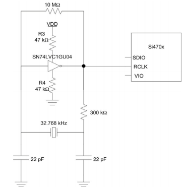 該電路采用無緩沖反相器,四個外部電阻,兩個電容和一個32.768KHZ.