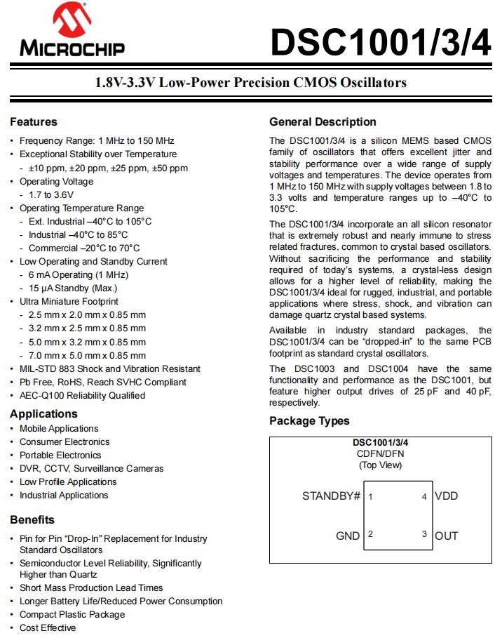 | DSC1001CI2-018.4320 | Microchip晶振 | DSC1001 | 18.432MHz | 1.8 V ~ 3.3 V |