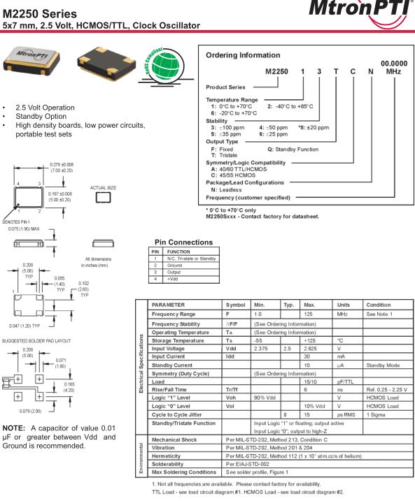 MtronPTI晶振,M2250晶振,M225013TCN20.0000MHz晶振,小型SMD有源晶振,從最初超大體積到現在的7050mm,6035mm,5032mm,3225mm,2520mm體積,有著翻天覆地的改變,體積的變小也使產品帶來了更高的穩定性能,接縫密封石英晶體振蕩器,精度高,覆蓋頻率范圍寬的特點,SMD高速自動安裝和高溫回流焊設計,Optionable待機輸出三態輸出功能,電源電壓范圍:1.8V~5V,高穩定性,低抖動,低功耗,主要應用領域:無線通訊,高端智能手機,平板筆記本WLAN,藍牙,數碼相機,DSL和其他IT產品的晶振應用,三態功能,PC和LCDM等高端數碼領域,符合RoHS/無鉛.