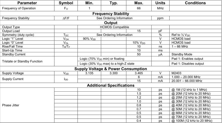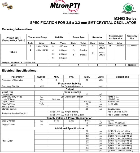 MtronPTI晶振,M2403晶振,M240324TCN26.000000MHz晶振,小型SMD有源晶振,從最初超大體積到現在的7050mm,6035mm,5032mm,3225mm,2520mm體積,有著翻天覆地的改變,體積的變小也使產品帶來了更高的穩定性能,接縫密封石英晶體振蕩器,精度高,覆蓋頻率范圍寬的特點,SMD高速自動安裝和高溫回流焊設計,Optionable待機輸出三態輸出功能,電源電壓范圍:1.8V~5V,高穩定性,低抖動,低功耗,主要應用領域:無線通訊,高端智能手機,平板筆記本WLAN,藍牙,數碼相機,DSL和其他IT產品的晶振應用,三態功能,PC和LCDM等高端數碼領域,符合RoHS/無鉛.