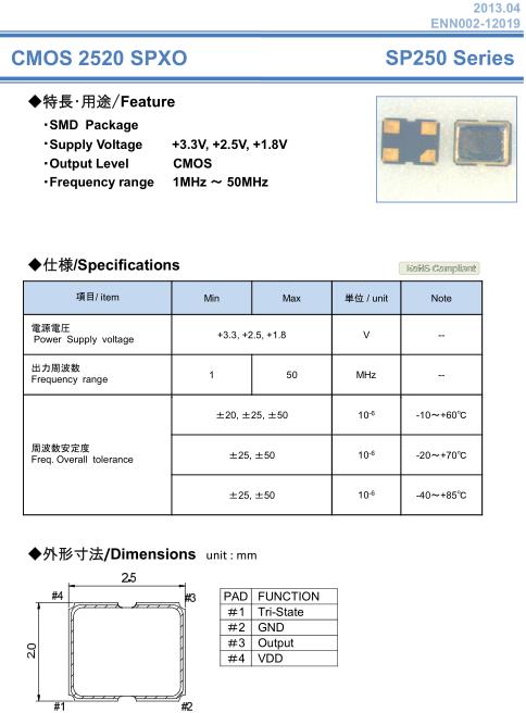 NAKA晶振,SP250晶振,無鉛晶振,有源晶振,是指晶體本身起振需要外部電壓供應,起振后可直接驅動CMOS集成電路,產品本身已實現與薄型IC(TSSOP封裝,TVSOP封裝)同樣的1mm厚度,斷開時的消費電流是15µA以下,編帶包裝方式可對應自動搭載及IR回流焊接(無鉛對應)產品有幾種電壓供選1.8V,2.5V,3V3.3V,5V,以應對不同IC產品需要.