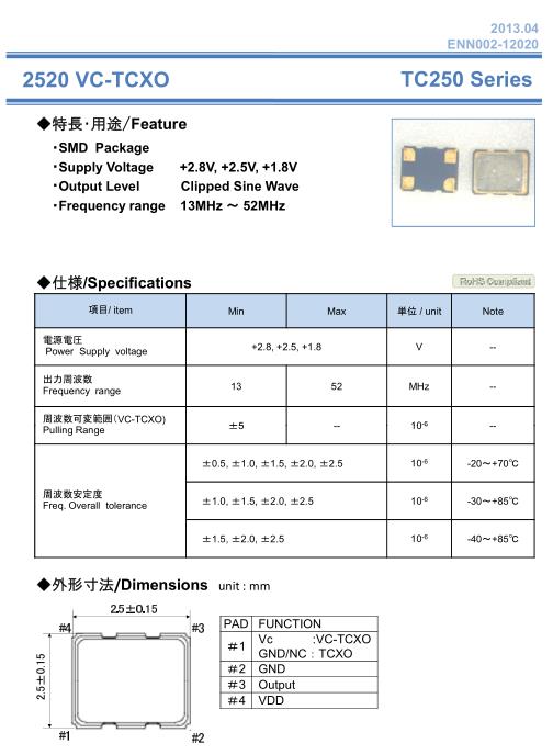 納卡晶振,TC250晶振,VC-TCXO壓控溫補晶振,有源晶振,是指晶體本身起振需要外部電壓供應,起振后可直接驅動CMOS集成電路,產品本身已實現與薄型IC(TSSOP封裝,TVSOP封裝)同樣的1mm厚度,斷開時的消費電流是15µA以下,編帶包裝方式可對應自動搭載及IR回流焊接(無鉛對應)產品有幾種電壓供選1.8V,2.5V,3V3.3V,5V,以應對不同IC產品需要.