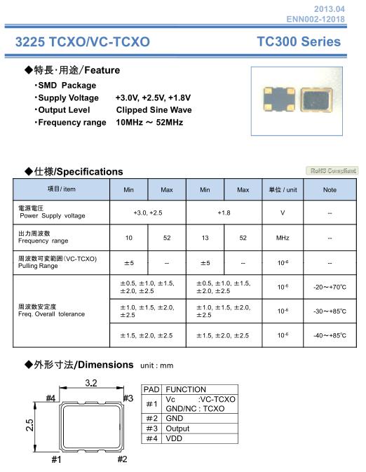NAKA晶振,TC300晶振,SMD振蕩器,小型SMD有源晶振,從最初超大體積到現在的7050mm,6035mm,5032mm,3225mm,2520mm體積,有著翻天覆地的改變,體積的變小也使產品帶來了更高的穩定性能,接縫密封石英晶體振蕩器,精度高,覆蓋頻率范圍寬的特點,SMD高速自動安裝和高溫回流焊設計,Optionable待機輸出三態輸出功能,電源電壓范圍:1.8V~5V,高穩定性,低抖動,低功耗,主要應用領域:無線通訊,高端智能手機,平板筆記本WLAN,藍牙,數碼相機,DSL和其他IT產品的晶振應用,三態功能,PC和LCDM等高端數碼領域,符合RoHS/無鉛.