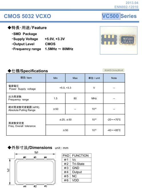 納卡晶振,VC500晶振,VCXO壓控晶振,5032mm體積的石英晶體振蕩器,有源晶振,該產品可驅動2.5V的溫補晶振,壓控晶振,VC-TCXO晶體振蕩器產品,電源電壓的低電耗型,編帶包裝方式,可對應自動高速貼片機自動焊接,及IR回流焊接(無鉛對應),為無鉛產品,超小型,質地輕.產品被廣泛應用到集成電路,程控交換系統,無線發射基站.