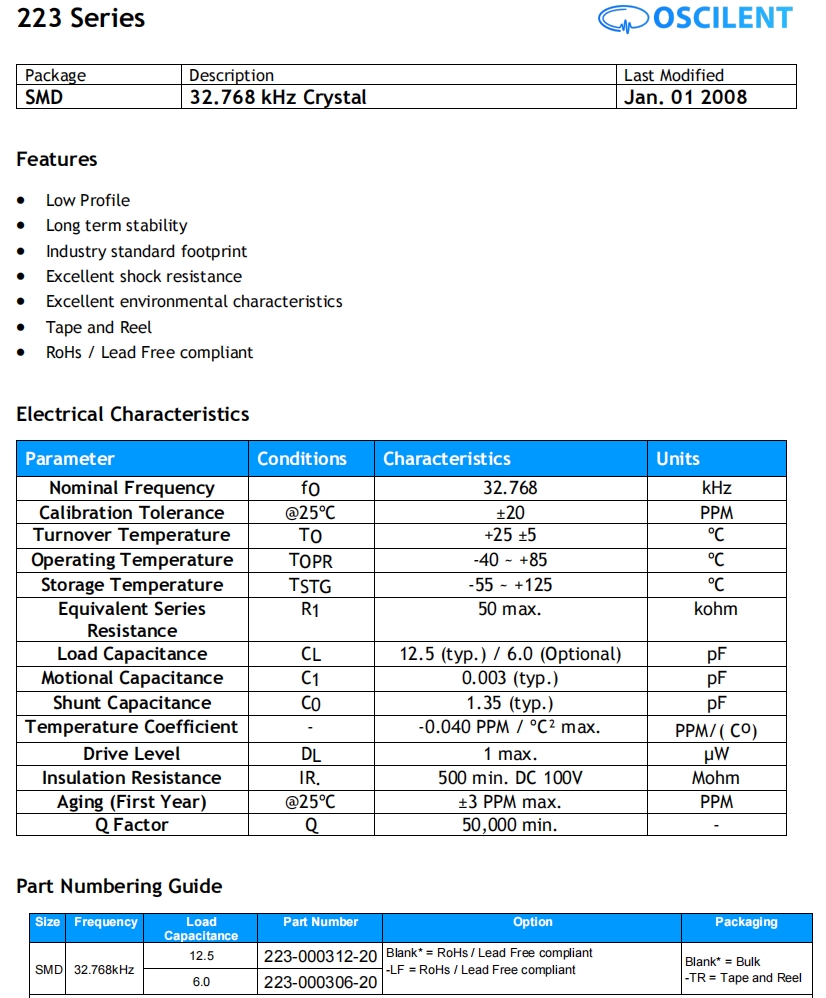 Oscilent陶瓷晶振\223-000312-20\6G時鐘晶振\223音叉晶體 參數(shù)表