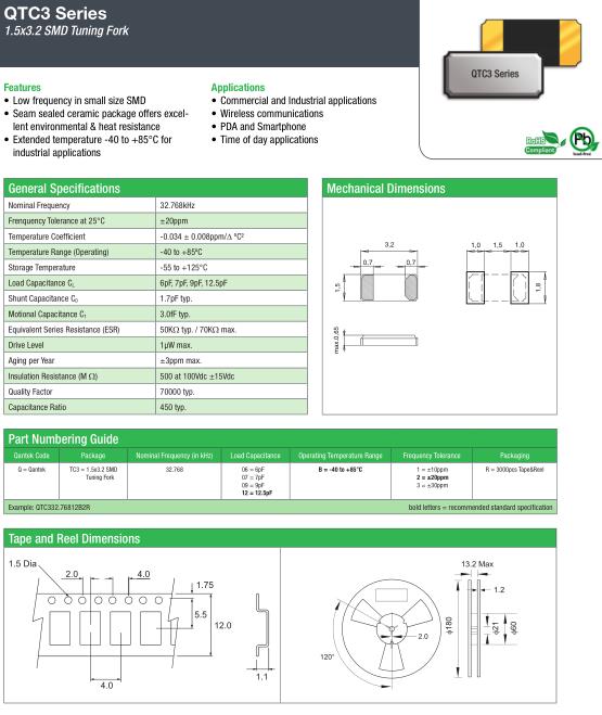 QANTEK晶振,QTC3晶振,QTC332.76812B2R晶振,小型貼片石英晶振,外觀尺寸具有薄型表面貼片型石英晶體振蕩器,特別適用于有小型化要求的市場領域,比如智能手機,無線藍牙,平板電腦等電子數碼產品.晶振本身超小型,薄型,重量輕,晶體具有優良的耐環境特性,如耐熱性,耐沖擊性,在辦公自動化,家電相關電器領域及Bluetooth,WirelessLAN等短距離無線通信領域可發揮優良的電氣特性,滿足無鉛焊接的回流溫度曲線要求.
