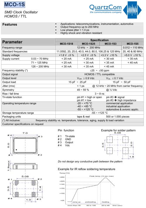 QuartzCom晶振,MCO-1S3晶振,OSC差分晶振,貼片晶振本身體積小,超薄型石英晶體振蕩器,特別適用于有目前高速發展的高端電子數碼產品,因為晶振本身小型化需求的市場領域,小型,薄型是對應陶瓷振蕩器(偏差大)和普通的石英晶體振蕩器(偏差小)的中間領域的一種性價比較出色的產品.產品廣泛用于筆記本電腦,無線電話,衛星導航SSD,USB,Blu-ray等用途,符合無鉛焊接的高溫回流焊曲線特性.