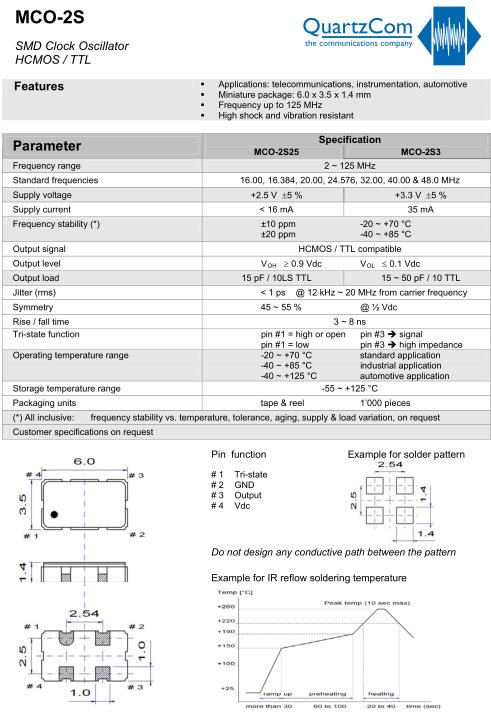 QuartzCom晶振,MCO-2S25晶振,6035mm晶振,小型SMD有源晶振,從最初超大體積到現(xiàn)在的7050mm,6035mm,5032mm,3225mm,2520mm體積,有著翻天覆地的改變,體積的變小也使產(chǎn)品帶來了更高的穩(wěn)定性能,接縫密封石英晶體振蕩器,精度高,覆蓋頻率范圍寬的特點,SMD高速自動安裝和高溫回流焊設(shè)計,Optionable待機輸出三態(tài)輸出功能,電源電壓范圍:1.8V~5V,高穩(wěn)定性,低抖動,低功耗,主要應(yīng)用領(lǐng)域:無線通訊,高端智能手機,平板筆記本W(wǎng)LAN,藍牙,數(shù)碼相機,DSL和其他IT產(chǎn)品的晶振應(yīng)用,三態(tài)功能,PC和LCDM等高端數(shù)碼領(lǐng)域,符合RoHS/無鉛.