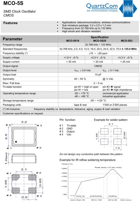 QuartzCom晶振,MCO-5S18晶振,OSC差分石英晶振,小型SMD有源晶振,從最初超大體積到現在的7050mm,6035mm,5032mm,3225mm,2520mm體積,有著翻天覆地的改變,體積的變小也使產品帶來了更高的穩定性能,接縫密封石英晶體振蕩器,精度高,覆蓋頻率范圍寬的特點,SMD高速自動安裝和高溫回流焊設計,Optionable待機輸出三態輸出功能,電源電壓范圍:1.8V~5V,高穩定性,低抖動,低功耗,主要應用領域:無線通訊,高端智能手機,平板筆記本WLAN,藍牙,數碼相機,DSL和其他IT產品的晶振應用,三態功能,PC和LCDM等高端數碼領域,符合RoHS/無鉛.