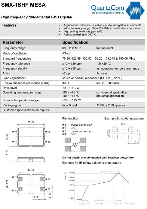 QuartzCom晶振,SMX-1SHF晶振,無源貼片晶振,貼片晶振本身體積小,超薄型石英晶體振蕩器,特別適用于有目前高速發展的高端電子數碼產品,因為晶振本身小型化需求的市場領域,小型,薄型是對應陶瓷振蕩器(偏差大)和普通的石英晶體振蕩器(偏差小)的中間領域的一種性價比較出色的產品.產品廣泛用于筆記本電腦,無線電話,衛星導航SSD,USB,Blu-ray等用途,符合無鉛焊接的高溫回流焊曲線特性.
