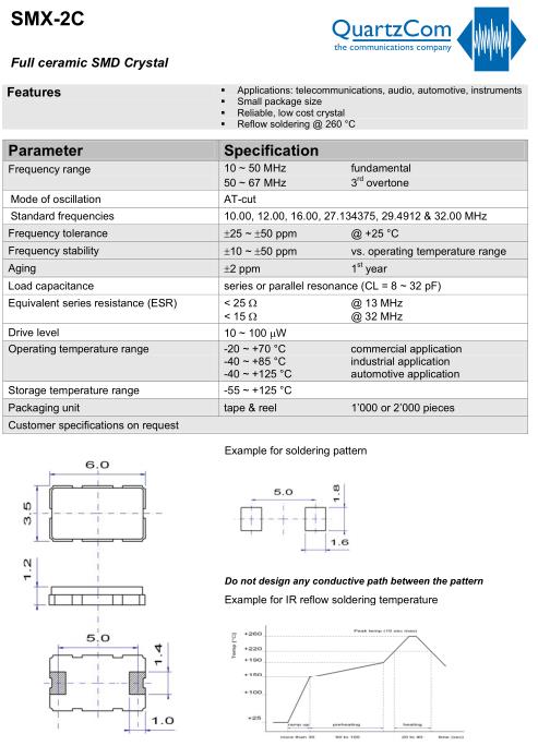 QuartzCom晶振,SMX-2C晶振,無源兩腳晶振,貼片晶振本身體積小,超薄型石英晶體振蕩器,特別適用于有目前高速發展的高端電子數碼產品,因為晶振本身小型化需求的市場領域,小型,薄型是對應陶瓷振蕩器(偏差大)和普通的石英晶體振蕩器(偏差小)的中間領域的一種性價比較出色的產品.產品廣泛用于筆記本電腦,無線電話,衛星導航SSD,USB,Blu-ray等用途,符合無鉛焊接的高溫回流焊曲線特性.