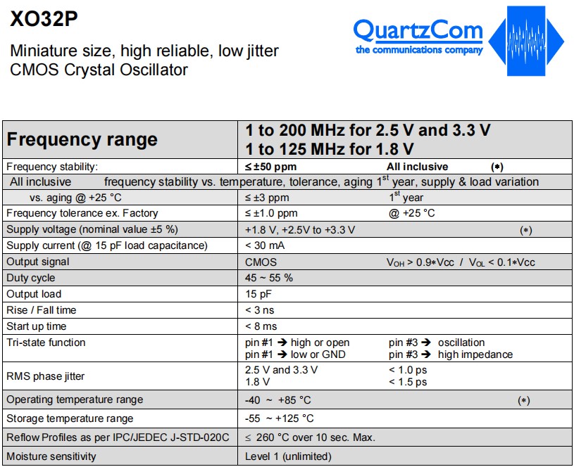 XO32P-H33-NN1u25-100.000MHz,3225mm,QuartzCom高可靠晶振,XO32P,低抖動晶振,參數表