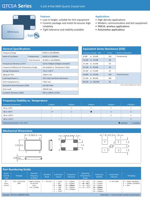 Quarztechnik晶振,QTC5A晶振,QTC5A12.0000FBT3I30R晶振,智能手機晶振,產品具有高精度超小型的表面貼片型石英晶體振蕩器,最適用于移動通信終端的基準時鐘等移動通信領域.比如智能手機,無線通信,衛(wèi)星導航,平臺基站等較高端的數(shù)碼產品,晶振本身小型,薄型具備各類移動通信的基準時鐘源用頻率,貼片晶振具有優(yōu)良的電氣特性,耐環(huán)境性能適用于移動通信領域,滿足無鉛焊接的高溫回流溫度曲線要求.