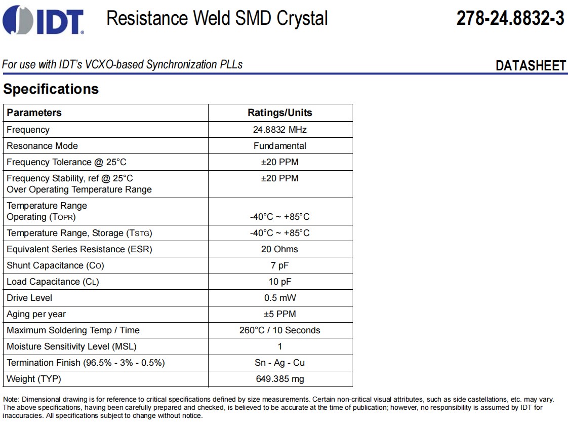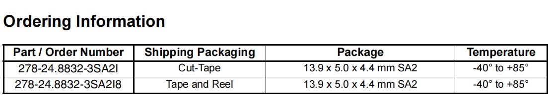 Renesas石英貼片晶振,278-24.8832-3SA2I,物聯網6G晶振,參數表