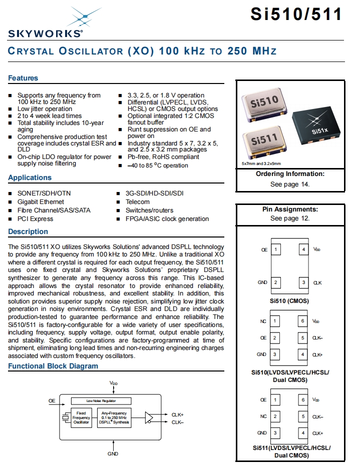 | 511BCA156M250AAG | Skyworks有源晶振 | XTAL OSC XO 156.2500MHZ LVDS SMD | Si511 | 156.25 MHz | LVDS | 3.3V |