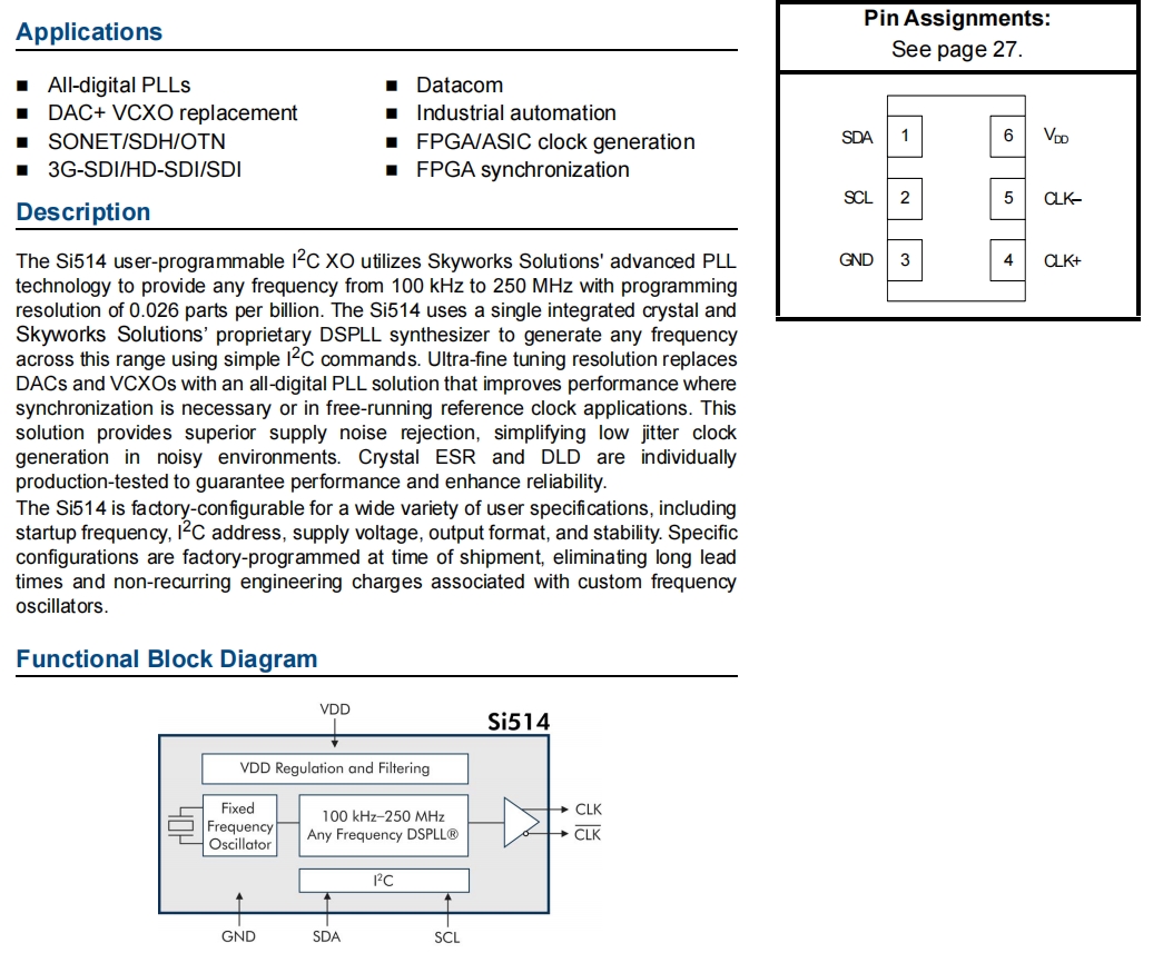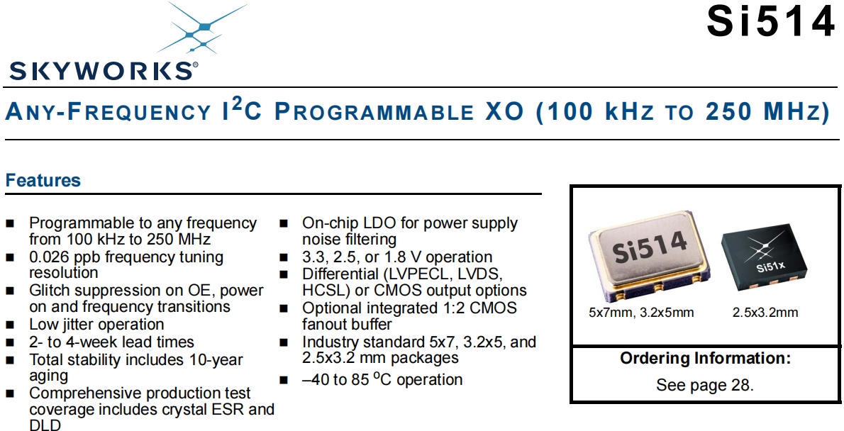 | 514BBA000290BAGR | Skyworks有源晶振 | DIFFERENTIAL/SINGLE-ENDED; I2C P | Si514 | 250 MHz | LVDS |