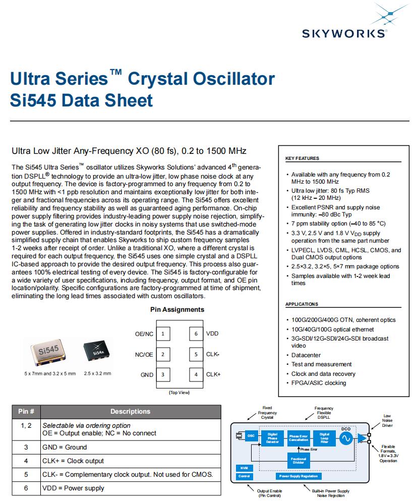 | 545BAA200M000BBG | Skyworks晶振 | Si545 | 200 MHz | LVDS | 1.8V, 2.5V, 3.3V |