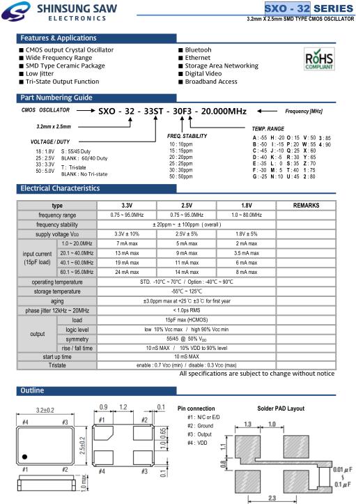 Shinsung晶振,SXO-32晶振,SXO-32-33ST-30F3-24.000MHz晶振,小型SMD有源晶振,從最初超大體積到現(xiàn)在的7050mm,6035mm,5032mm,3225mm,2520mm體積,有著翻天覆地的改變,體積的變小也使產(chǎn)品帶來了更高的穩(wěn)定性能,接縫密封石英晶體振蕩器,精度高,覆蓋頻率范圍寬的特點(diǎn),SMD高速自動安裝和高溫回流焊設(shè)計,Optionable待機(jī)輸出三態(tài)輸出功能,電源電壓范圍:1.8V~5V,高穩(wěn)定性,低抖動,低功耗,主要應(yīng)用領(lǐng)域:無線通訊,高端智能手機(jī),平板筆記本W(wǎng)LAN,藍(lán)牙,數(shù)碼相機(jī),DSL和其他IT產(chǎn)品的晶振應(yīng)用,三態(tài)功能,PC和LCDM等高端數(shù)碼領(lǐng)域,符合RoHS/無鉛.