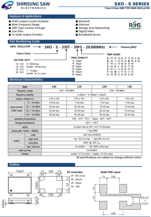 Shinsung晶振,SXO-S晶振,SXO-S-33ST-30F3-20.000MHz晶振,小型SMD有源晶振,從最初超大體積到現(xiàn)在的7050mm,6035mm,5032mm,3225mm,2520mm體積,有著翻天覆地的改變,體積的變小也使產品帶來了更高的穩(wěn)定性能,接縫密封石英晶體振蕩器,精度高,覆蓋頻率范圍寬的特點,SMD高速自動安裝和高溫回流焊設計,Optionable待機輸出三態(tài)輸出功能,電源電壓范圍:1.8V~5V,高穩(wěn)定性,低抖動,低功耗,主要應用領域:無線通訊,高端智能手機,平板筆記本WLAN,藍牙,數(shù)碼相機,DSL和其他IT產品的晶振應用,三態(tài)功能,PC和LCDM等高端數(shù)碼領域,符合RoHS/無鉛.
