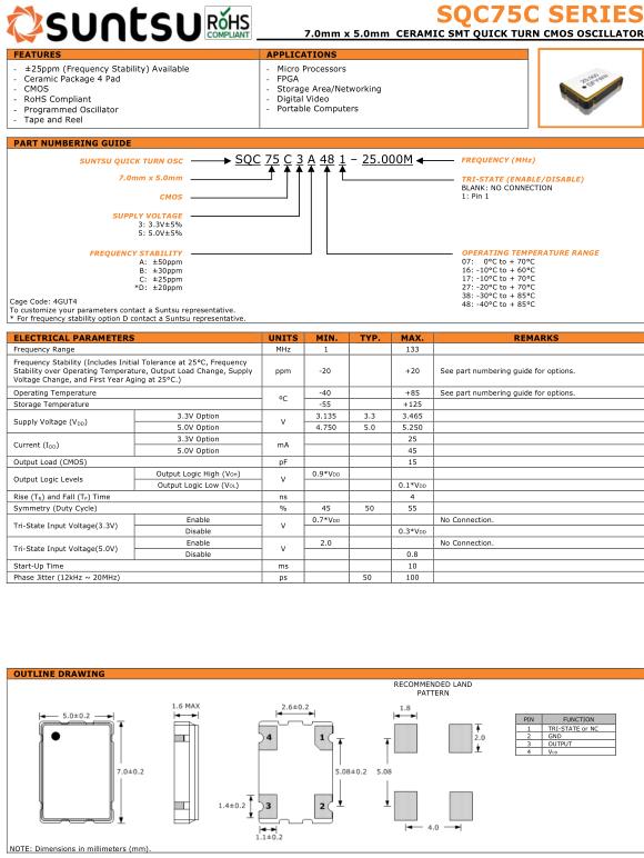 松圖晶振,SQC75C晶振,SQC75C3A481-24.000M晶振,小型SMD有源晶振,從最初超大體積到現在的7050mm,6035mm,5032mm,3225mm,2520mm體積,有著翻天覆地的改變,體積的變小也使產品帶來了更高的穩定性能,接縫密封石英晶體振蕩器,精度高,覆蓋頻率范圍寬的特點,SMD高速自動安裝和高溫回流焊設計,Optionable待機輸出三態輸出功能,電源電壓范圍:1.8V~5V,高穩定性,低抖動,低功耗,主要應用領域:無線通訊,高端智能手機,平板筆記本WLAN,藍牙,數碼相機,DSL和其他IT產品的晶振應用,三態功能,PC和LCDM等高端數碼領域,符合RoHS/無鉛.