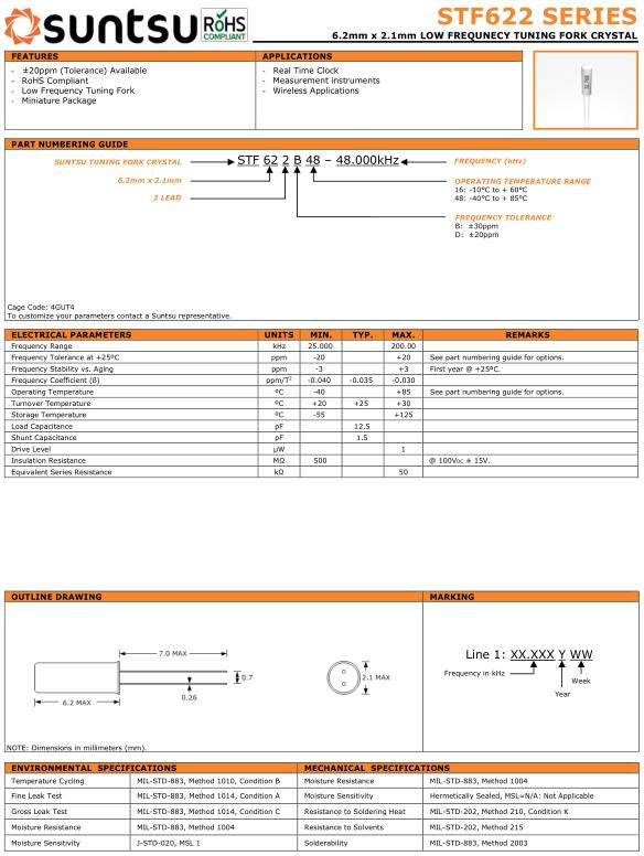 Suntsu晶振,STF622晶振,STF622B48-20.000kHz晶振,插件石英晶振最適合用于比較低端的電子產品,比如兒童玩具,普通家用電器,即使在汽車電子領域中也能使產品高可靠性的使用.并且可用于安全控制裝置的CPU時鐘信號發生源部分,好比時鐘單片機上的石英晶振,在極端嚴酷的環境條件下,晶振也能正常工作,具有穩定的起振特性,高耐熱性,耐熱循環性和耐振性等的高可靠性能.