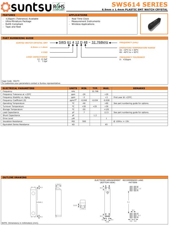 Suntsu晶振,SWS614晶振,SWS61412D48-32.768kHz晶振,32.768K時(shí)鐘晶體具有小型,薄型,輕型的貼片晶振表面音叉型晶體振蕩器,產(chǎn)品具有優(yōu)良的耐熱性,耐環(huán)境特性,可發(fā)揮晶振優(yōu)良的電氣特性,符合RoHS規(guī)定,滿足無(wú)鉛焊接的高溫回流溫度曲線要求,金屬外殼的封裝使得產(chǎn)品在封裝時(shí)能發(fā)揮比陶瓷振蕩器外殼更好的耐沖擊性.