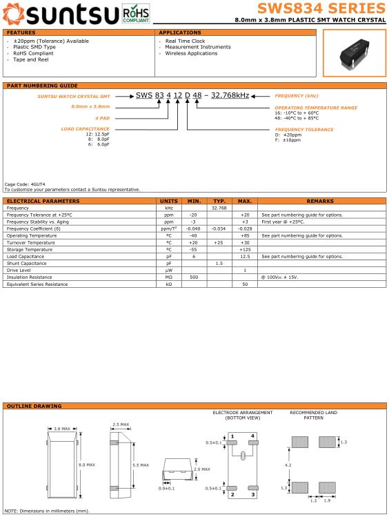 Suntsu晶振,SWS834晶振,SWS83412D48-32.768kHz晶振,32.768K時鐘晶體具有小型,薄型,輕型的貼片晶振表面音叉型晶體振蕩器,產品具有優(yōu)良的耐熱性,耐環(huán)境特性,可發(fā)揮晶振優(yōu)良的電氣特性,符合RoHS規(guī)定,滿足無鉛焊接的高溫回流溫度曲線要求,金屬外殼的封裝使得產品在封裝時能發(fā)揮比陶瓷振蕩器外殼更好的耐沖擊性.