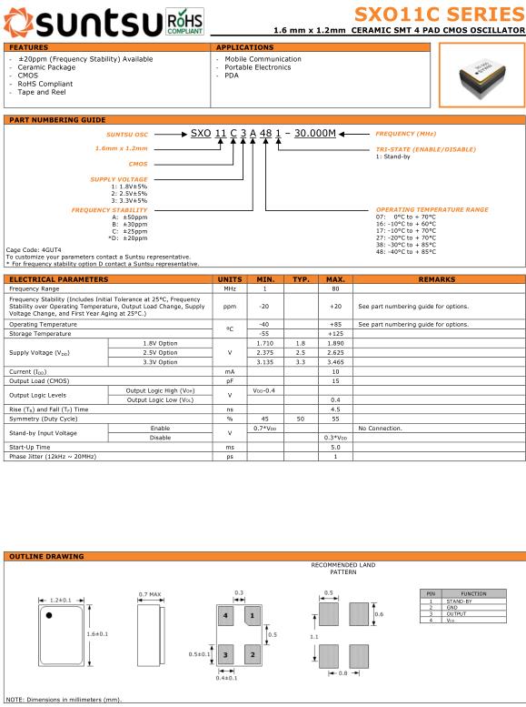 Suntsu晶振,SXO11C晶振,SXO11C3A481-20.000M晶振,小型SMD有源晶振,從最初超大體積到現(xiàn)在的7050mm,6035mm,5032mm,3225mm,2520mm體積,有著翻天覆地的改變,體積的變小也使產(chǎn)品帶來了更高的穩(wěn)定性能,接縫密封石英晶體振蕩器,精度高,覆蓋頻率范圍寬的特點,SMD高速自動安裝和高溫回流焊設(shè)計,Optionable待機輸出三態(tài)輸出功能,電源電壓范圍:1.8V~5V,高穩(wěn)定性,低抖動,低功耗,主要應(yīng)用領(lǐng)域:無線通訊,高端智能手機,平板筆記本W(wǎng)LAN,藍(lán)牙,數(shù)碼相機,DSL和其他IT產(chǎn)品的晶振應(yīng)用,三態(tài)功能,PC和LCDM等高端數(shù)碼領(lǐng)域,符合RoHS/無鉛.