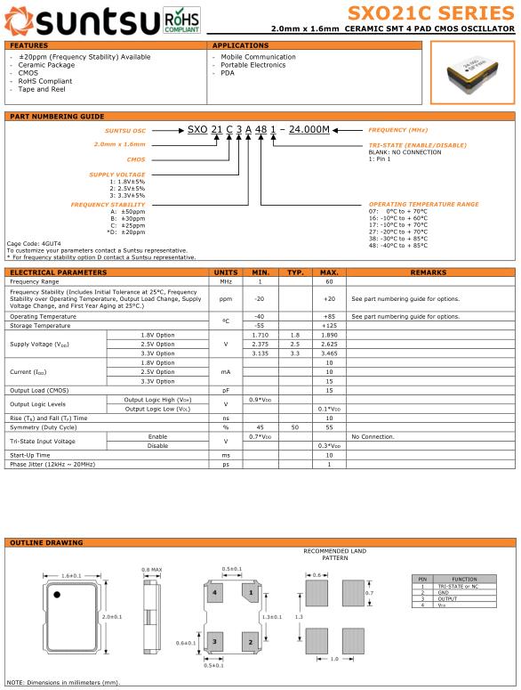 松圖晶振,SXO21C晶振,SXO21C3A481-24.000M晶振,貼片式石英晶體振蕩器,低電壓啟動功率,并且有多種電壓供選擇,比如有1.8V,2.5V,3.3V,3.8V,5V等,產品被廣泛應用于,平板筆記本,GPS系統,光纖通道,千兆以太網,串行ATA,串行連接SCSI,PCI-Express的SDH/SONET發射基站等領域.符合RoHS/無鉛.
