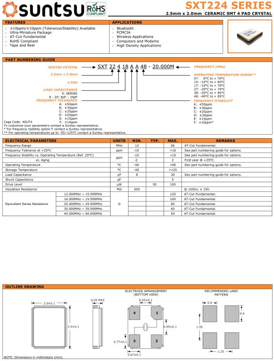 Suntsu晶振,SXT224晶振,SXT22418AA48-20.000M晶振,小型貼片石英晶振,外觀尺寸具有薄型表面貼片型石英晶體振蕩器,特別適用于有小型化要求的市場領(lǐng)域,比如智能手機,無線藍牙,平板電腦等電子數(shù)碼產(chǎn)品.晶振本身超小型,薄型,重量輕,晶體具有優(yōu)良的耐環(huán)境特性,如耐熱性,耐沖擊性,在辦公自動化,家電相關(guān)電器領(lǐng)域及Bluetooth,WirelessLAN等短距離無線通信領(lǐng)域可發(fā)揮優(yōu)良的電氣特性,滿足無鉛焊接的回流溫度曲線要求.