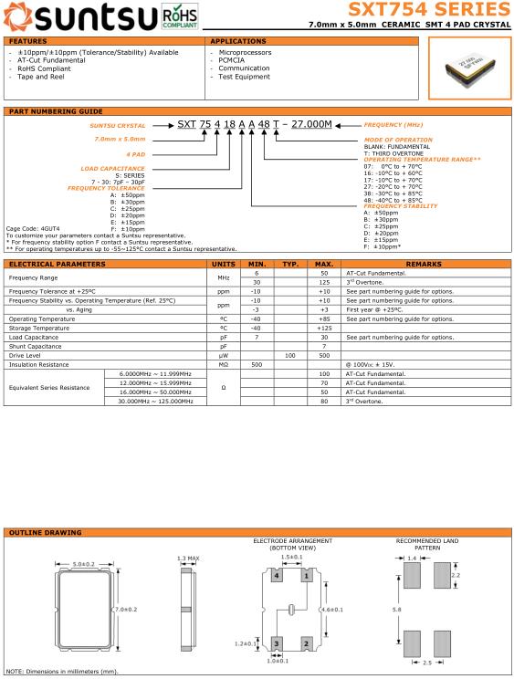 Suntsu晶振,SXT754晶振,SXT75418AA48T-26.000M晶振,貼片晶振本身體積小,超薄型石英晶體振蕩器,特別適用于有目前高速發展的高端電子數碼產品,因為晶振本身小型化需求的市場領域,小型,薄型是對應陶瓷振蕩器(偏差大)和普通的石英晶體振蕩器(偏差小)的中間領域的一種性價比較出色的產品.產品廣泛用于筆記本電腦,無線電話,衛星導航SSD,USB,Blu-ray等用途,符合無鉛焊接的高溫回流焊曲線特性.